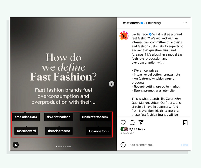 They’re tagged on the educational Instagram post to add that trust to Vestiaire Collective’s communications:
