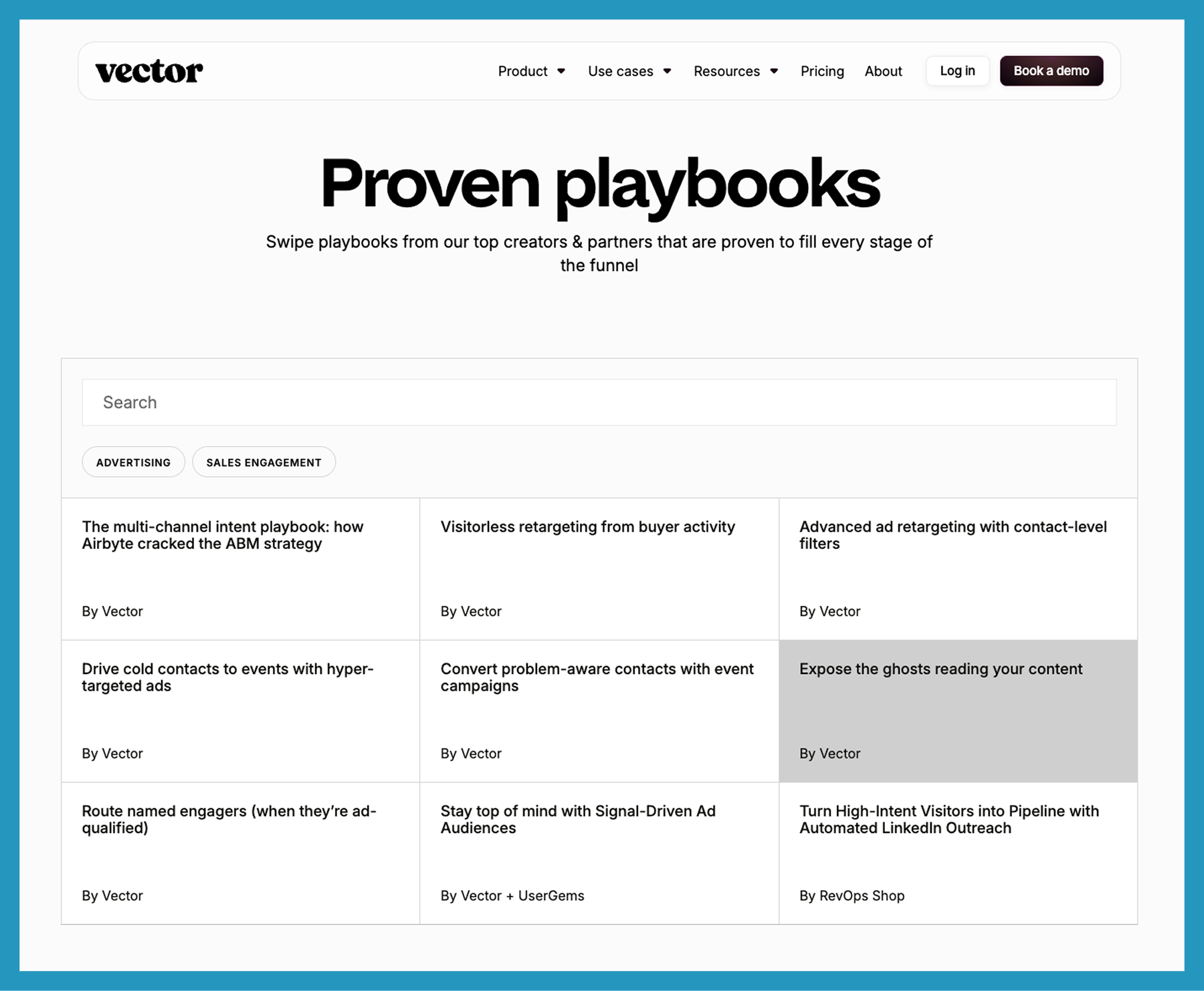 Some playbooks feature partners or customers, others are Vector themselves sharing different ways to use their platform.