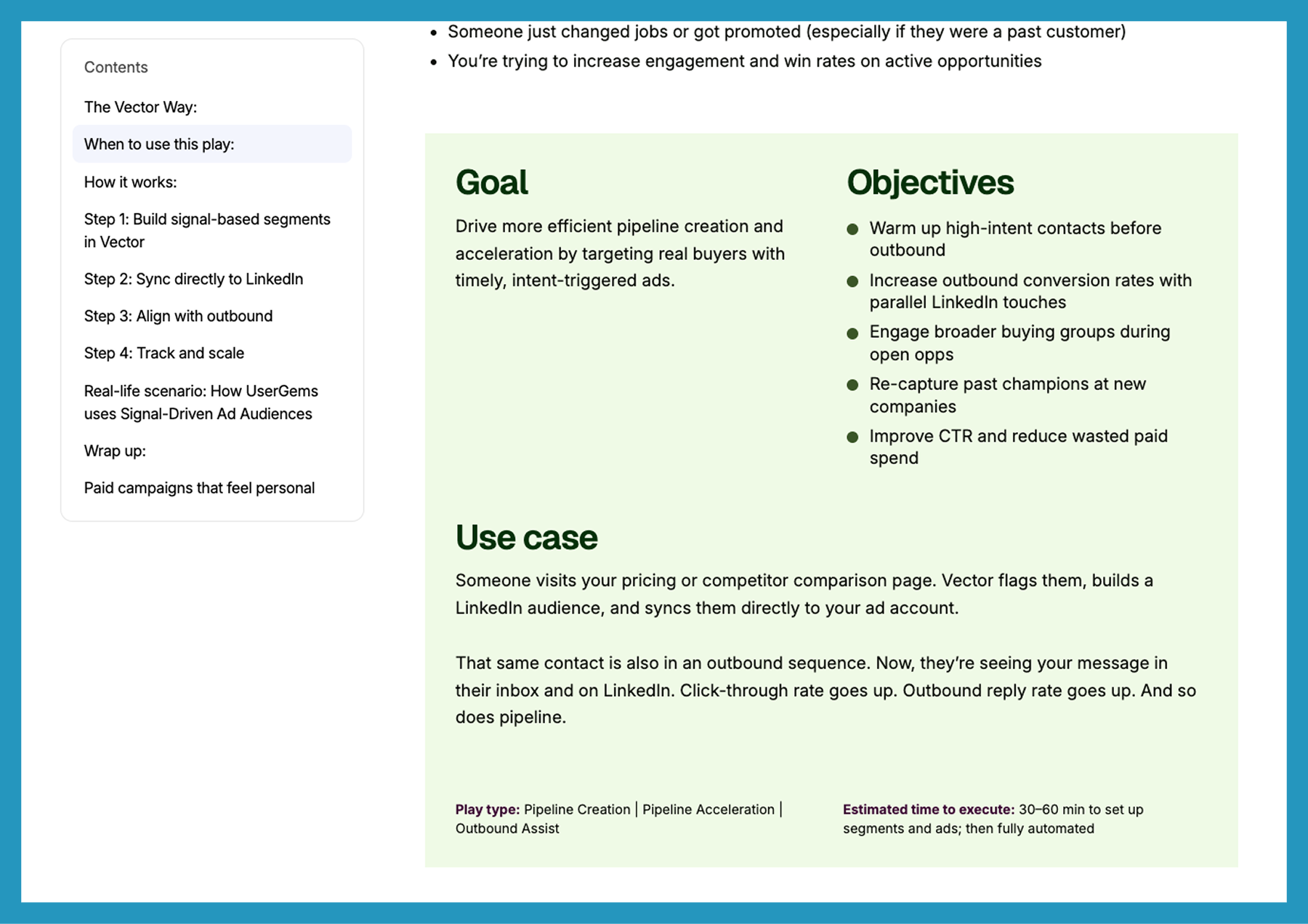 - A strong foundation for multi-format distribution. The playbooks also act as foundational content, which can become the jumping-off point for other formats and channels – like the RevOps Shop case study on automating LinkedIn outreach which was turned into a LinkedIn Live workshop, with Josh Perk (Vector’s CEO) talking through the playbook with the CEO of RevOps Shop.