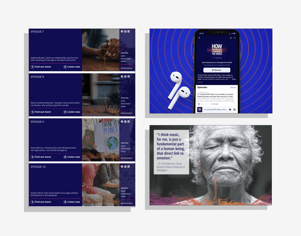 - Writing interview questions for the podcast and scripting the voiceover which ran alongside the interview – which meant gaining a deep understanding of each piece of research chosen